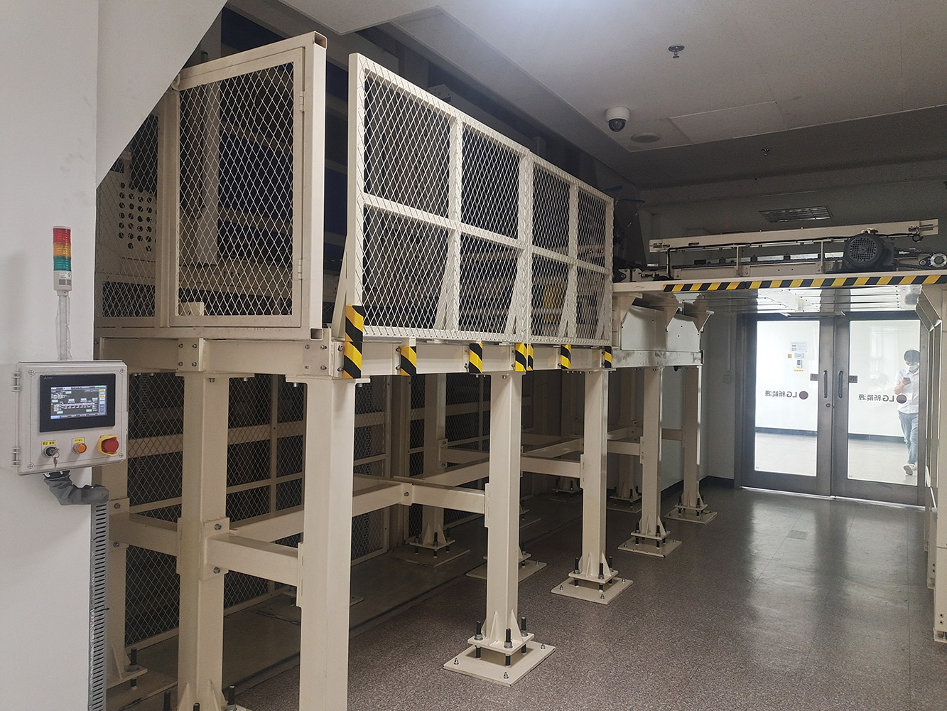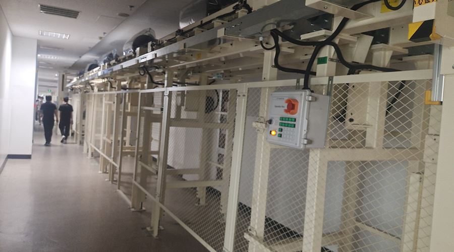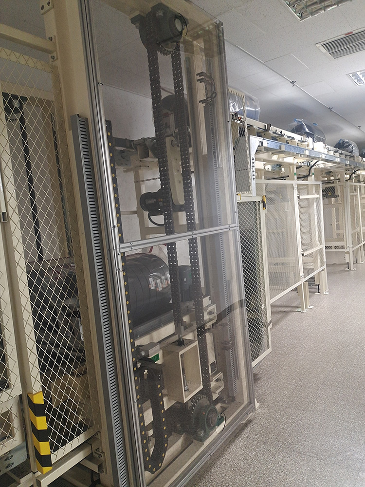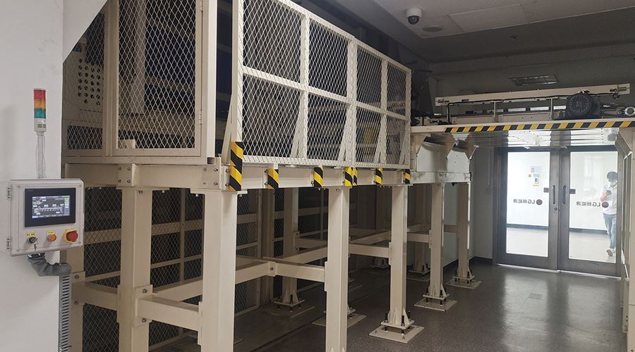 通过物流输送系统,将1楼的货物分别输送至2楼或3楼VD室内,供室内生产使用。该套系统包含LIFT输送机,高空物流线、地面高位物流线、旋转物流线、高空平台RGV有轨小车、升降物流线、牙叉移栽设备、空栈板堆层升降机、快速卷帘门及配套的安全防护设备。