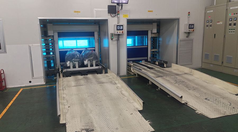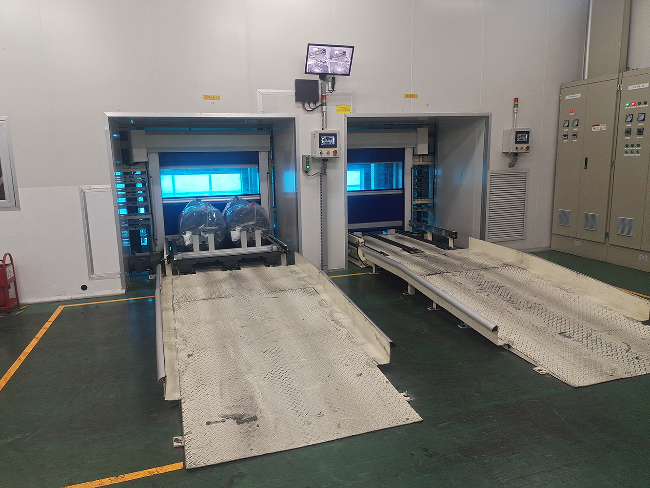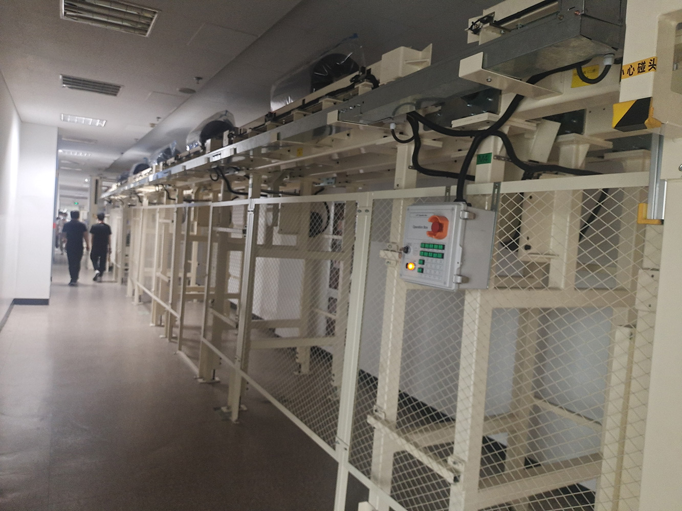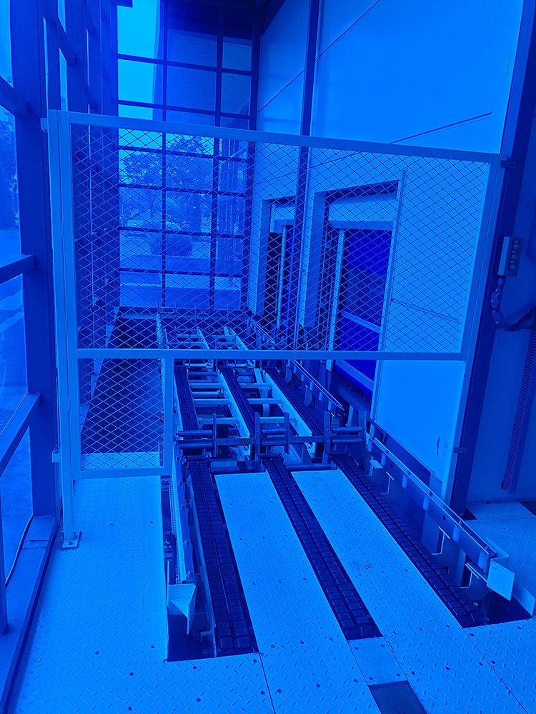 通过物流输送系统,将1楼的货物分别输送至2楼或3楼VD室内,供室内生产使用。该套系统包含LIFT输送机,高空物流线、地面高位物流线、旋转物流线、高空平台RGV有轨小车、升降物流线、牙叉移栽设备、空栈板堆层升降机、快速卷帘门及配套的安全防护设备。
